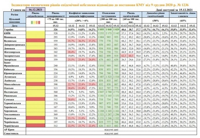 Станом на 16 грудня у червоній зоні адаптивного карантину знаходяться Київська і ще сім областей України.