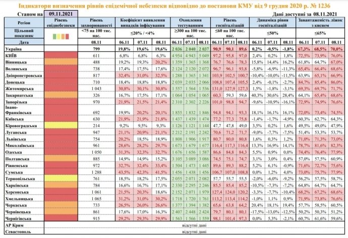 Станом на 9 листопада, до червоної зони епідемічної небезпеки віднесено Київ, Волинську, Дніпропетровську, Донецьку, Житомирську, Запорізьку, Івано-Франківську, Київську, Луганську, Львівську, Миколаївську, Одеську, Рівненську, Сумську, Херсонську, Хмельницьку, Чернігівську області.