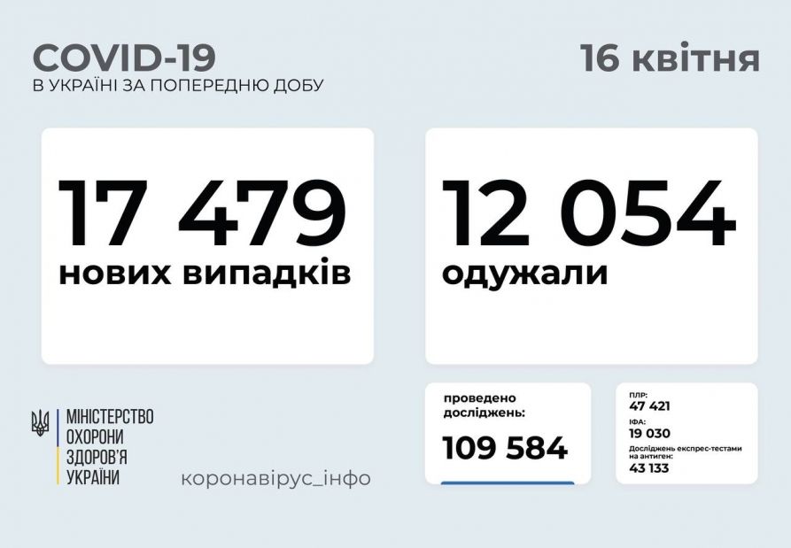 17 479 нових випадків коронавірусної хвороби COVID-19 зафіксовано в Україні станом на 16 квітня 2021 року. Зокрема, захворіли 709 дітей та 378 медпрацівників.