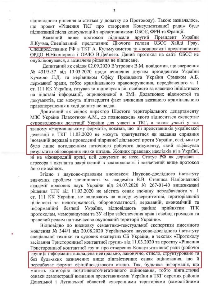 СБУ закрила кримінальне провадження щодо можливої державної зради ексглави української делегації в Тристоронній контактній групі та Президента України Леоніда Кучми й очільника Офісу президента Андрія Єрмака. Йдеться про погодження так званої консультативної ради за участі представників "Л/ДНР".