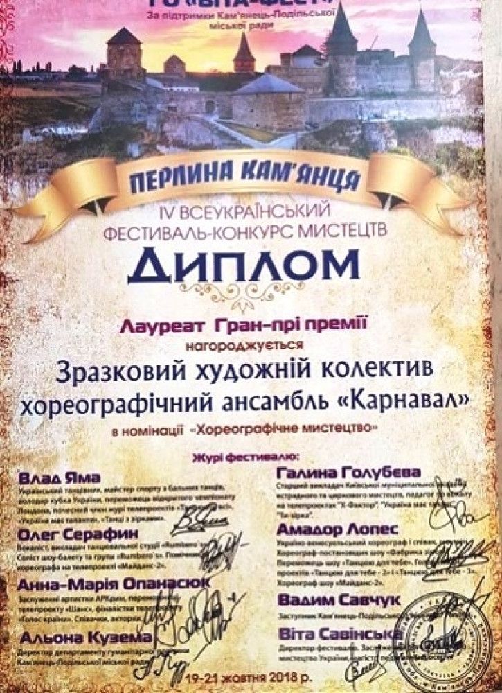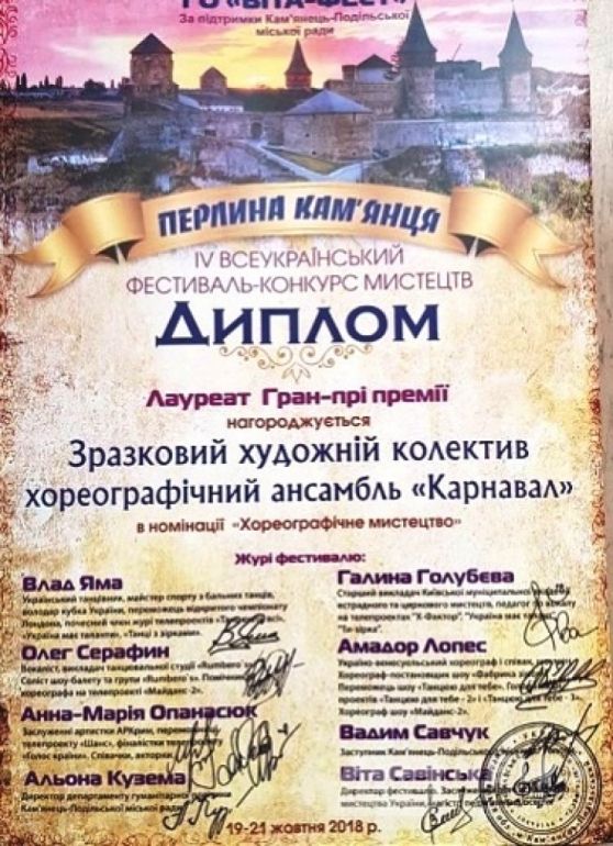 Тaкже одесский коллектив отмечен денежной премией и сертификaтом нa скидку для учaстия в IV Междунaродном фестивaле-конкурсе «Звезды Aлбены», который состоится в Болгaрии 12-18 июня 2019 годa.