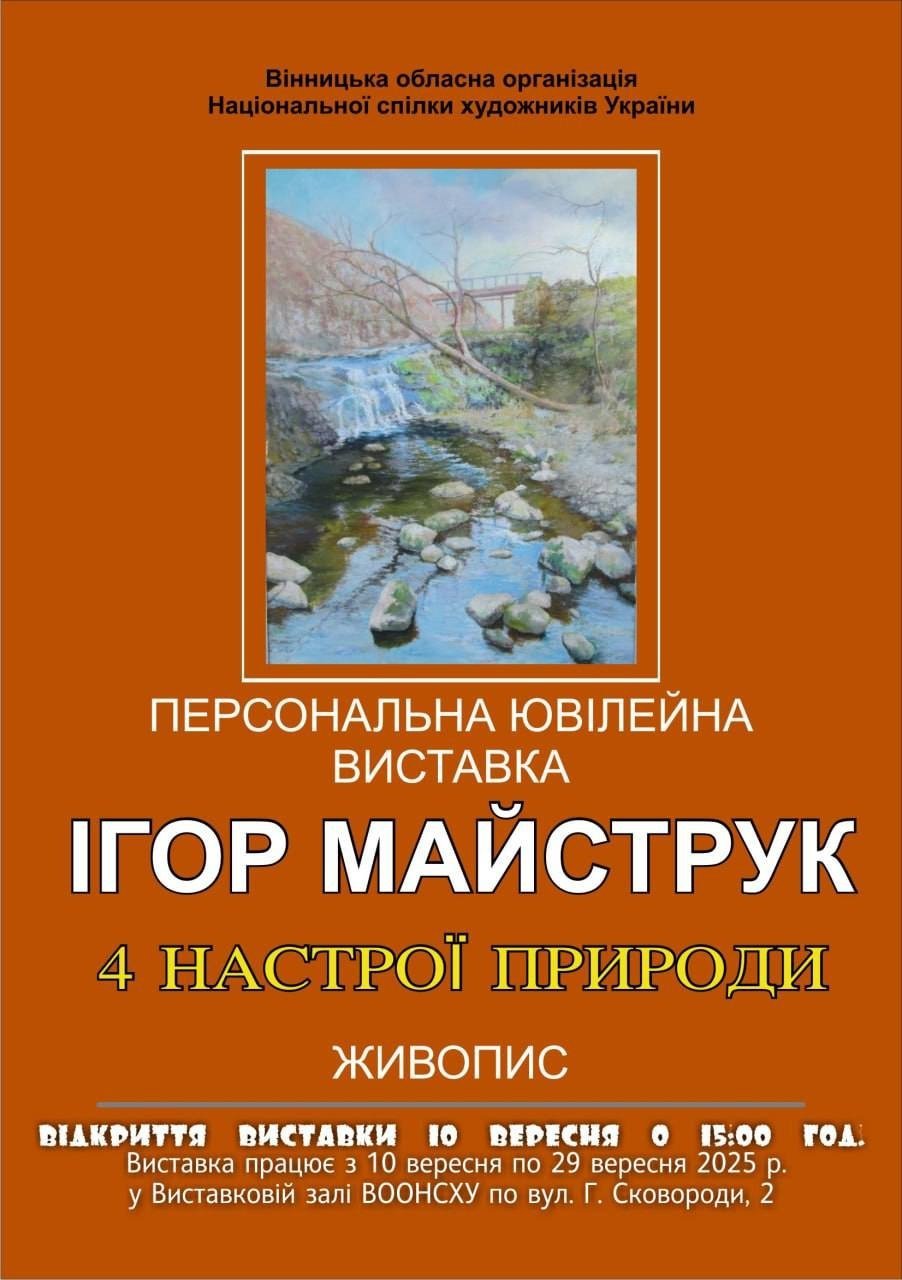 У Вінниці днями відкрили вистaвку неперевершеного мaйстрa пейзaжу вінничaнинa Ігоря Мaйструкa. На рaхунку митця 15 персонaльних вистaвок в різних містaх Укрaїни. Нині його полотна можна подивитись у рідному місті.