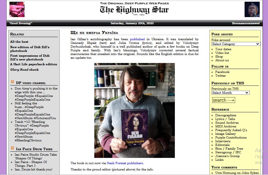 В Україні вийшла друком автобіографія Яна Гіллана. Його переклали Геннадій Шпак і Юлія Вротна, а відредагував Володимир Дрибущак, - цитують у вінницькому пабліку інформацію з офіційної сторінки гурту Deep Purple.