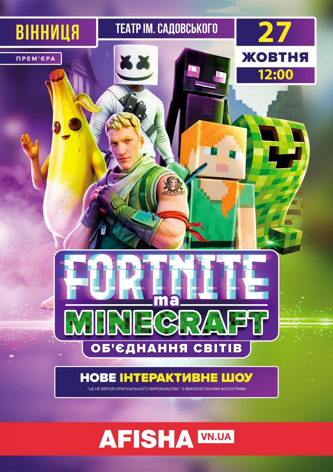 Прем'єра феєричної шоу-вистави «Фортнайт та Майнкрафт. Об'єднання світів» у неділю, 27 жовтня, о 12.00 у Вінницькому театрі ім. Садовського вразить і діток, і батьків!
