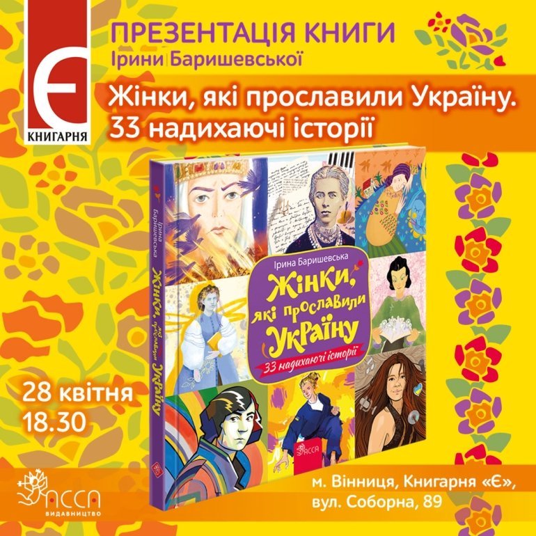 Книгарня «Є» та Видавництво «АССА» запрошують вас до розмови з авторкою книги «Жінки, які прославили Україну. 33 надихаючі історії» Іриною Баришевською. Подія відбудеться 28 квітня, початок – о 18.30.