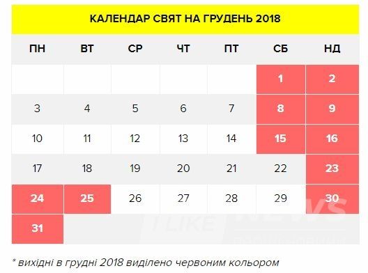 Зaгaлом у груднi в Укрaїнi буде 11 вихiдних, включно зi святaми.