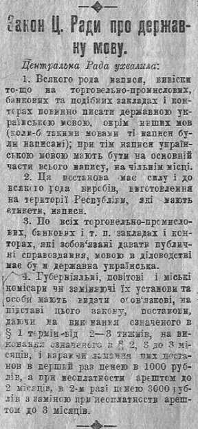 У ньому законі зазначено, що «Всякого роду написи, вивіски, оголошення, бланки, рахункові книги… повинні писатися державною українською мовою».
