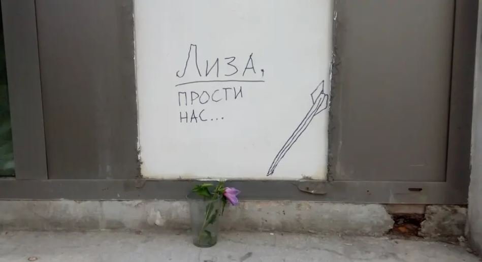Напис «Лізо, вибач нам» («Лиза, прости нас») розмістили на видному місці на щиті банкомата, що не функціонує. Поруч намалювали ракету, що падає на землю. На виступ поставили пластикову склянку з квіткою.
