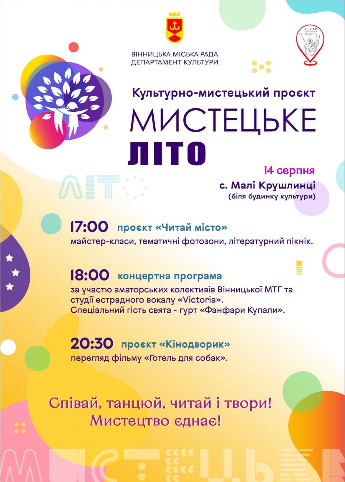 «Проєкт «Мистецьке літо» успішно реалізовується не тільки у Вінниці, а й на приєднаних територіях. Він пройшов у Вінницьких Хуторах, Щітках та Десні. Цієї суботи «Мистецьке літо» пройде у селі Малі Крушлинці. Запрошуємо усіх охочих долучитися до свята», – зазначив директор департаменту культури міської ради Максим Філанчук.