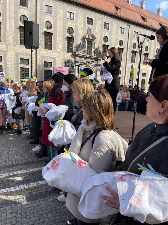 Учасниці Маршу Матерів в Мюнхені вкотре зібрались на Odeonsplatz. Вже третя хода українських жінок у цьому місті пройшла у єднанні з акцією за мир в Україні, організованого громадянським рухом VITSCHE. Цього разу до акції долучилася заслужена артистка України Оксана Стебельська, вона вимовила зворушливу промову про українську матір і жінку та заспівала народну пісню “Червона калина”. Також виступила бандуристка Наталія Холоденко з піснею “Ніч яка місячна”, а керівник Маршу у Мюнхеніі Ірина Тарасова об’явила зі сцени хвилину мовчання.