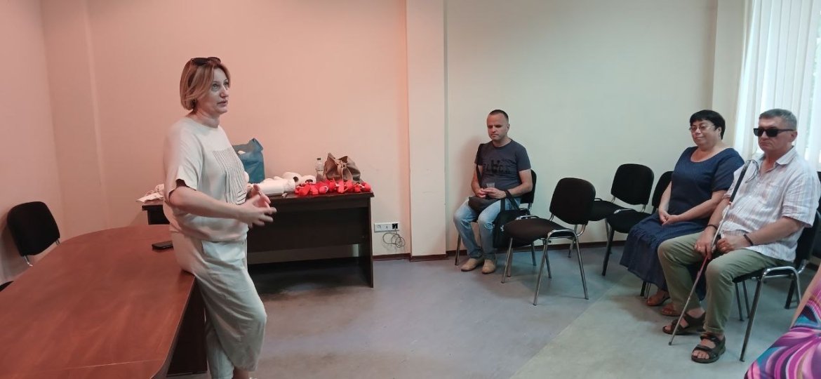 На тренінгу йшлося, як в побутових умовах зупиняти кров після вибухів та інших травмуючи факторів. Слухачами були член місцевого осередку УТОС і підприємства незрячих.