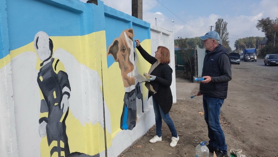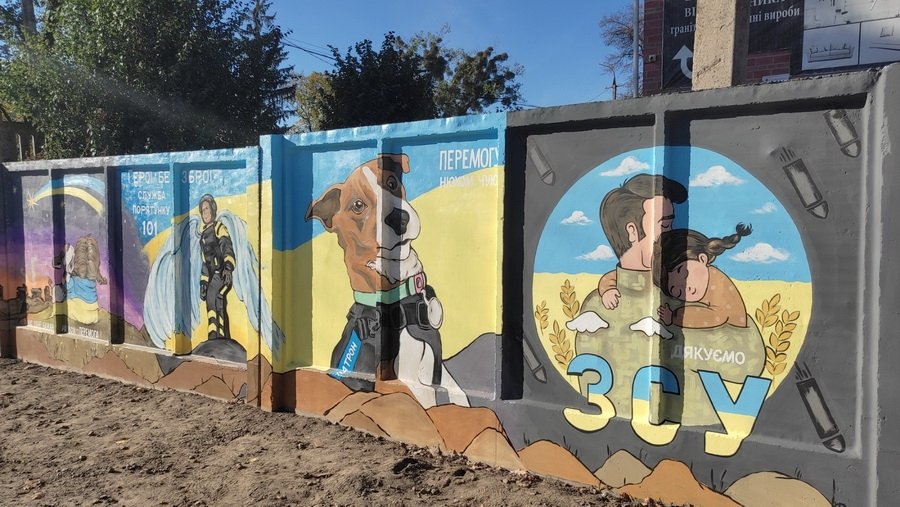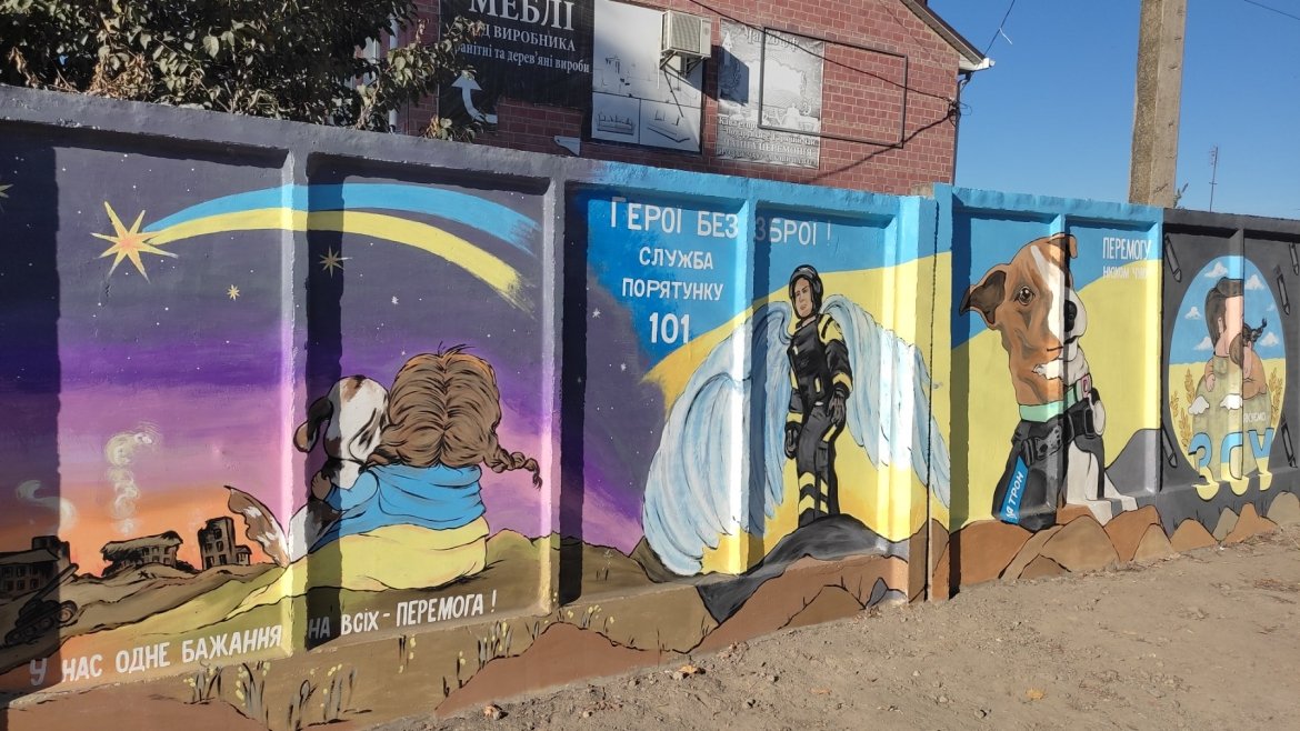 Пес Патрон, рятувальник з крилами, військовий з дитиною на руках – такі малюнки тепер прикрашають стіну біля однієї із зупинок громадського транспорту у Гнівані.