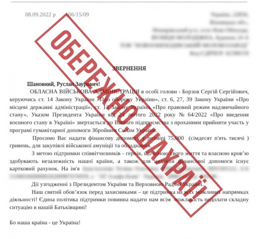 Шахраї у «зверненнях» просять керівників підприємств «взяти участь у програмі гуманітарної допомоги ЗСУ - 75 тисяч гривень для закупівлі військової амуніції».
