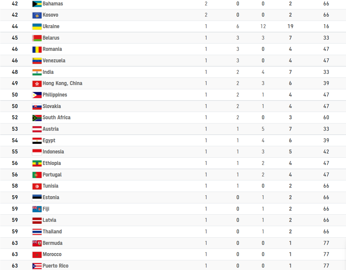 Але якщо розглядати тільки загальну кількість виграних нагород без урахування сорту медалей, то результат українців чудовий. З 19 нагород (одна золота, шість срібних і дванадцять бронзових) наша команда зайняла 16-у позицію між Південною Кореєю та Іспанією.