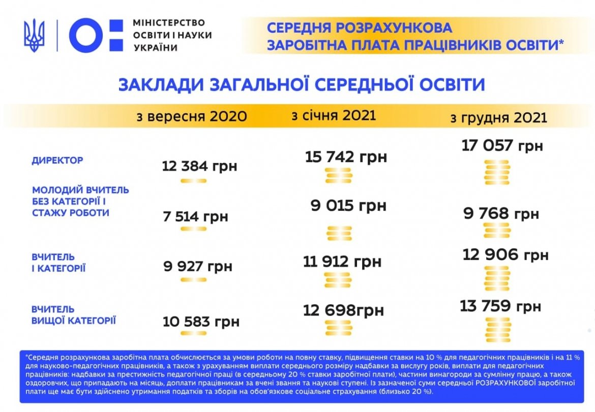 З 1 січня 2021 року зарплати зросли на 20%, для цього Міністерству освіти і науки України було передбачено видатки з держбюджету обсягом у 139,5 млрд гривень, що на 26,6 млрд гривень більше, ніж у 2020 році.