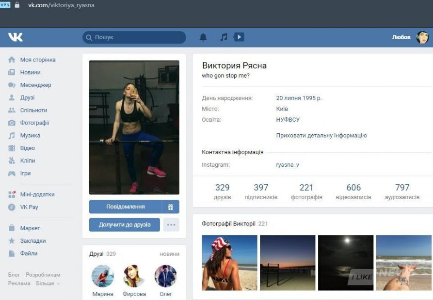 Я не знайшла сторінку Вікторії у Фесбуці, зате до середини 2018 року вона активно вела сторінку Вконтакте.