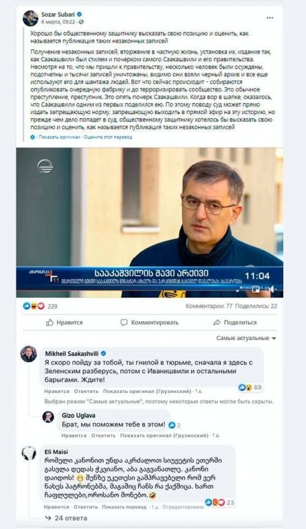 У Грузії в самому розпалі скандал через таємні аудіозаписи переговорів за участю прем'єр-міністра Гарібашвілі, сина засновника правлячої партії "Грузинська мрія" Іванішвілі та інших чиновників. У зв'язку з цим депутат Созар Субарі на своїй фейсбук-сторінці назвав Саакашвілі - злочинцем, після чого в коментарі під пост прийшов сам Михайло і його захисники.