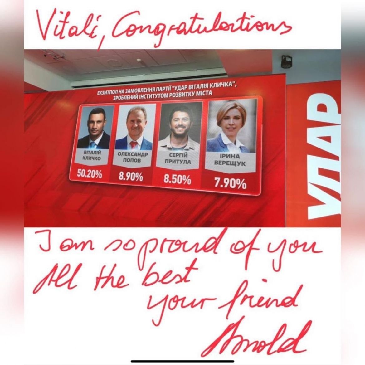 Це повідомлення він проілюстрував фотографією результатів екзит-полу Інституту розвитку міста, яка була підписана так: "Віталій, привітання! Пишаюся тобою. Всього найкращого. Твій друг Арнольд" (Vitali, congratulations. I am so proud of you. All the best. Your friend Arnold ).