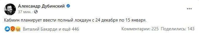 Про це повідомив в Facebook народний депутат від "Слуги народу" Олександр Дубінський. Він уточнив, що жорсткий карантин триватиме до 15 січня.