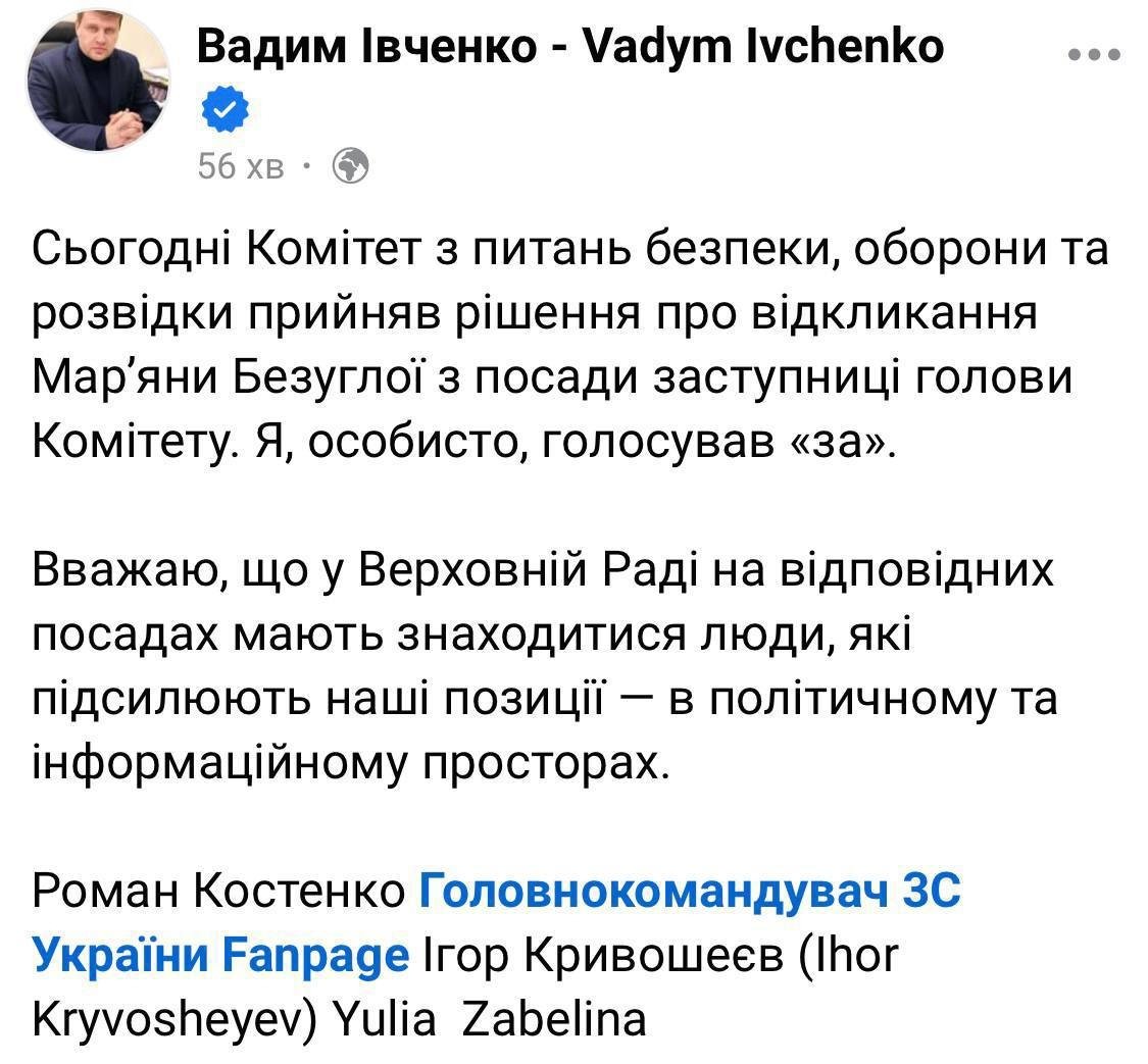 Марʼяну Безуглу відкликали з посади заступника голови комітету з нацбезпеки.
