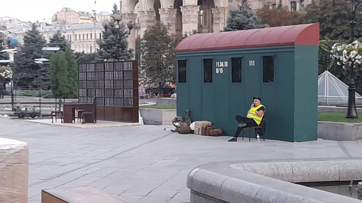 Предмети, які входять в інсталяцію, огородили металевим парканом. На фото, опублікованих УНІАН, видно, що предмети охороняють чоловіки в жовтих жилетах. На Банковій обіцяли змінити концепцію виставки, яка викликала обурення громадськості. Однак на Майдан привезли ті самі експонати – радянські меблі, телевізор, зазначили журналісти.