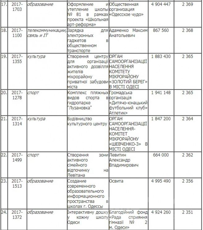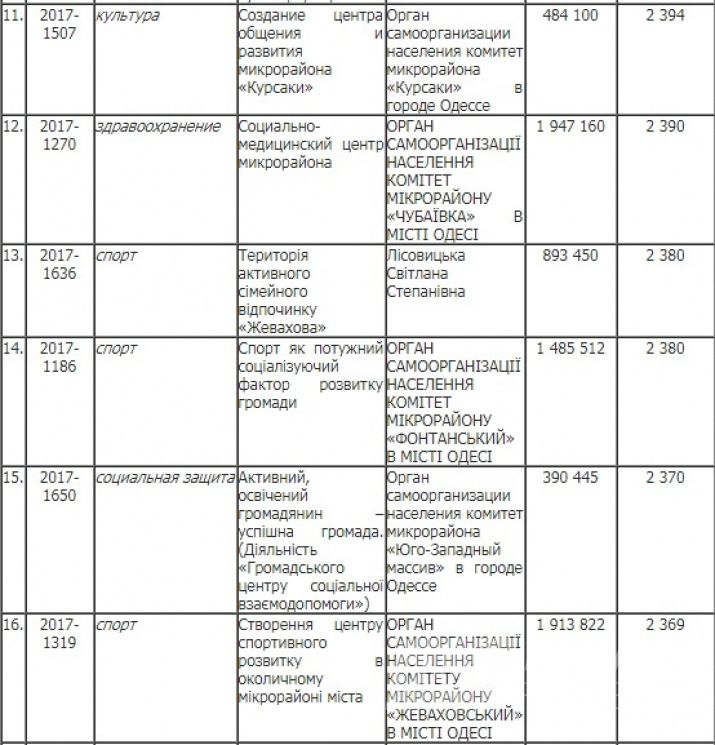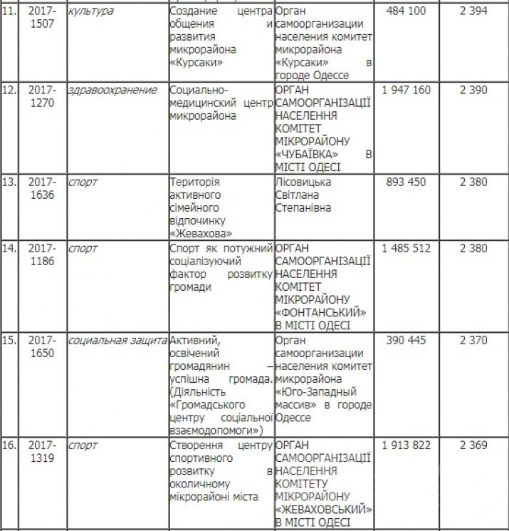 На розгляд були представлені проекти, які охоплюють різні сфери життя. Більшість з них стосувалися охорони здоров'я та спорту. Саме спортивна категорія стала лідером за кількістю переможців: з 38 зареєстрованих схвалення від одеситів отримали 12. А от що стосується проектів, які пов'язані з охороною здоров'я, то лише три з 52 зареєстрованих підтримали одесити. Стільки ж ідей перемогли в категоріях «Туризм»,«Інфраструктура дорожнього руху» та «Екологія». У культурній сфері, соціальному захисті та освіті переможцями стали по чотири ініціативи, а зміни у комунальному господарстві проведуть по двох проектах. У рубриках «Енергозбереження» і «Телекомунікації, зв'язок та ІТ» перемогло лишень по одній задумці.
