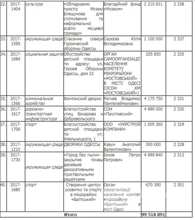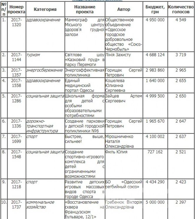 Звичайно, кожен автор проекту скаже, що його ініціатива найважливіша для міста. Це зрозуміло: кожен кулик своє болото хвалить. Але «Громадський бюджет» не «гумовий», і тому кошти отримають не всі. Переглянемо загальний рейтинг переможців голосування.