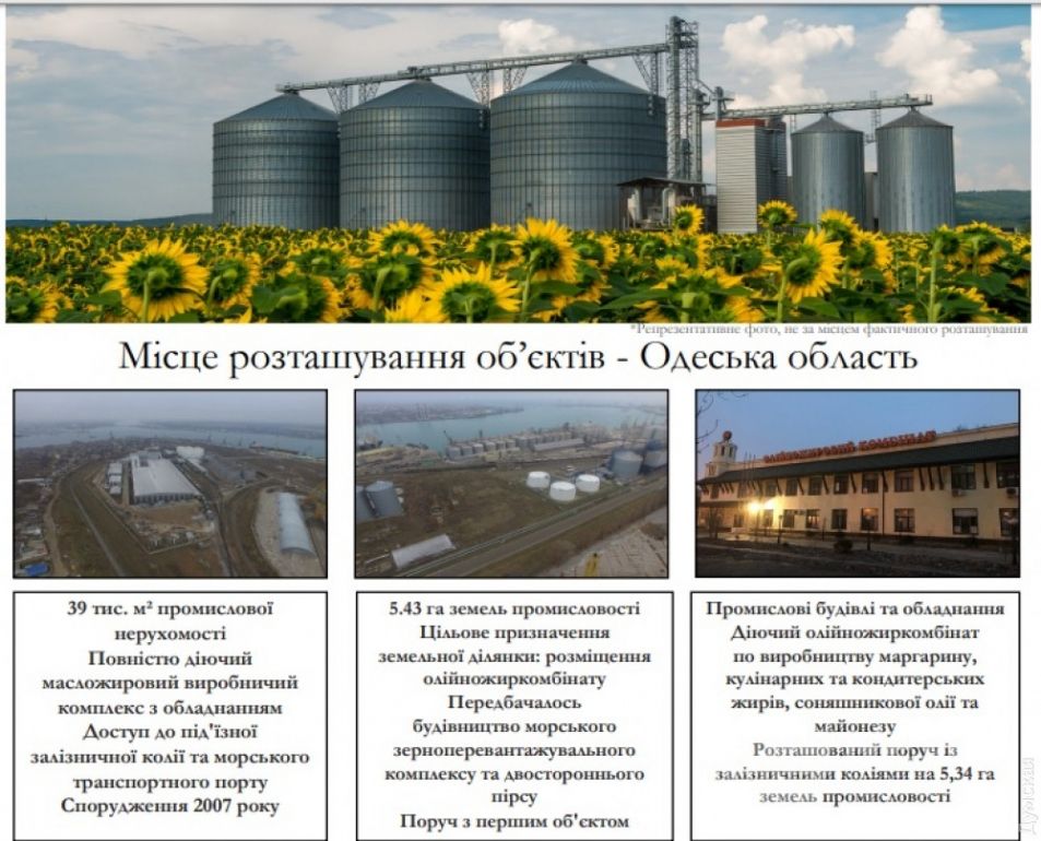 Среди них - некогдa крупнейший в регионе Одесский мaсложиркомбинaт нa Среднефонтaнской улице, мaсложировой комбинaт в Черноморске, a тaкже земельный учaсток площaдью 5,43 гa возле Черноморского портa, где плaнировaлось строительство морского зерноперегрузочного комплексa.