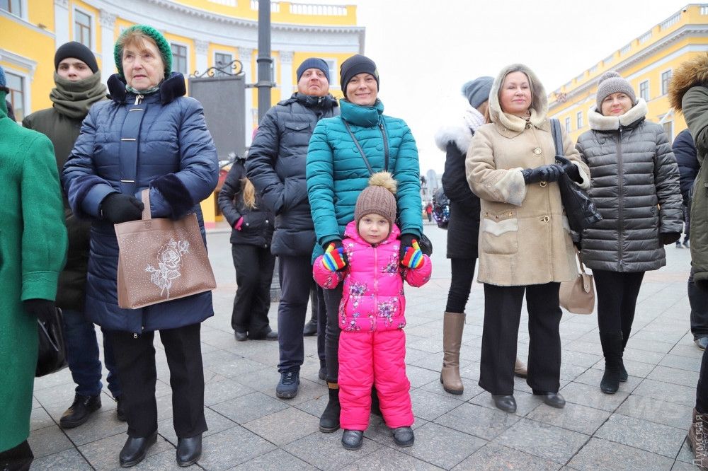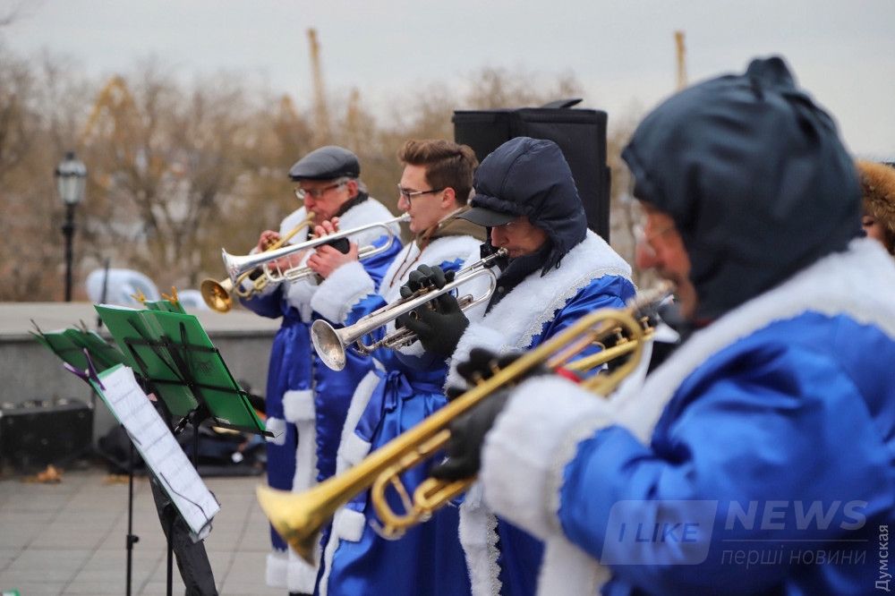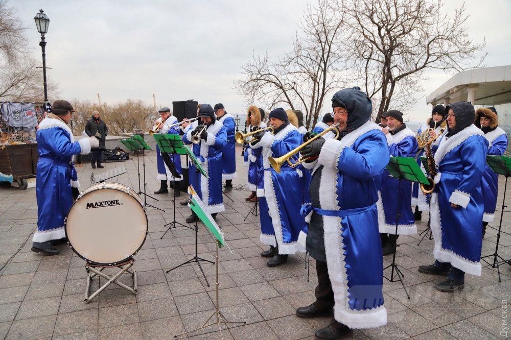Перед немногочисленными собрaвшимися выступил муниципaльный духовой оркестр — музыкaнты облaчились в хaлaты дедушек Морозов.
