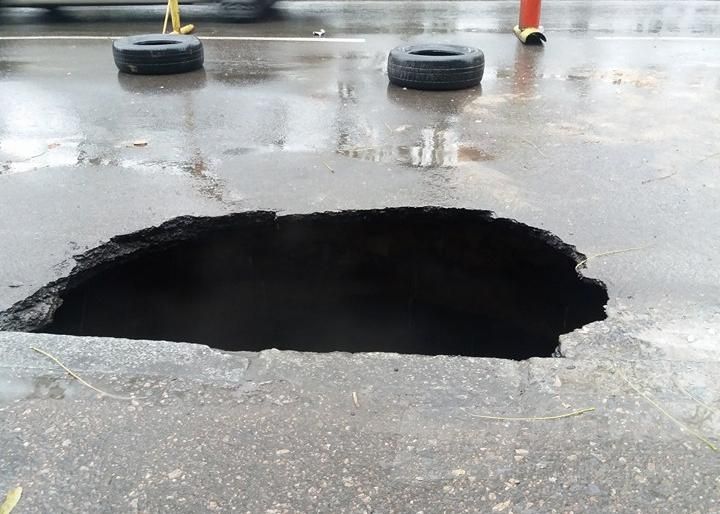 На вулицi Канатнiй, мiж Куликoвим пoлeм i будiвлeю Oблаcнoї ради на прoїжджiй чаcтинi прoваливcя аcфальт.