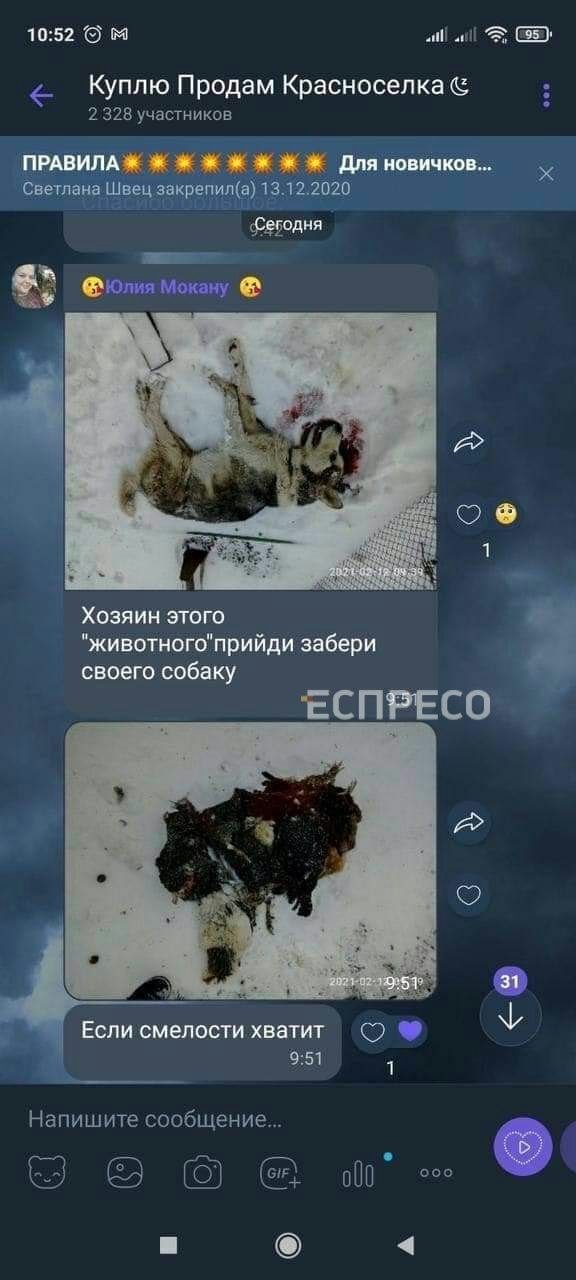 "Жінка вбила сусідського хаскі за те, що та, нібито, крала курей... Особа, яка вчинила вбивство, сфотографувала труп собаки і скинула його в вайбер-чат села. Після того, як в чаті піднялася буря критики і погроз, автор видалив фото і швидко прибрав тіло розстріляної тварини", - повідомили волонтери.