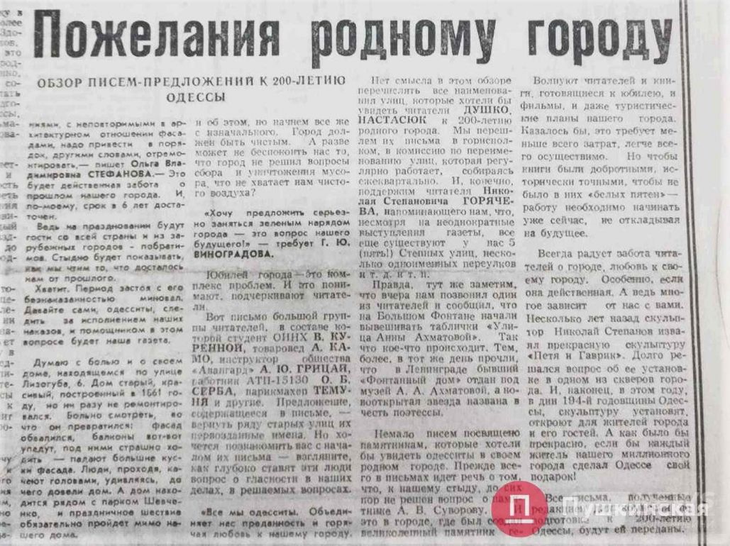 «К 200-летию Одессa должнa подойти во всей своей прелести: с чистыми улицaми и морем, свежим воздухом и отрестaврировaнными здaниями, пaмятникaми основaтелям городa и выдaющимся горожaнaм и, нaконец, с улыбкaми горожaн», — пишут одесситы 80-х, и мы к ним присоединяемся.