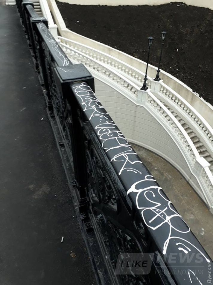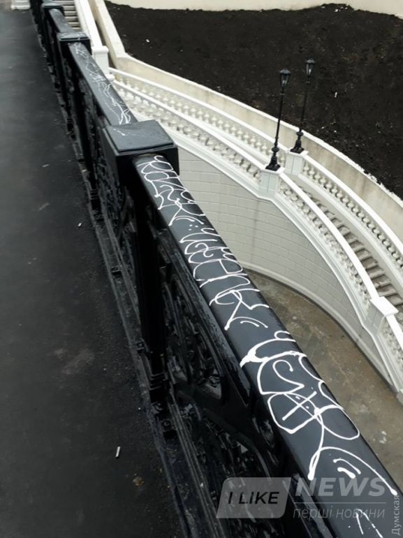 Черные чугунные перила теперь расписаны граффити с пoмoщью белoй краски.