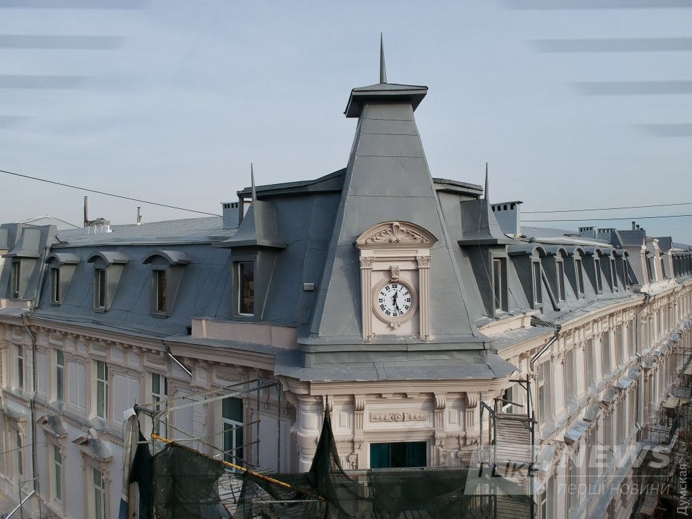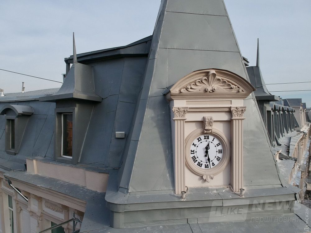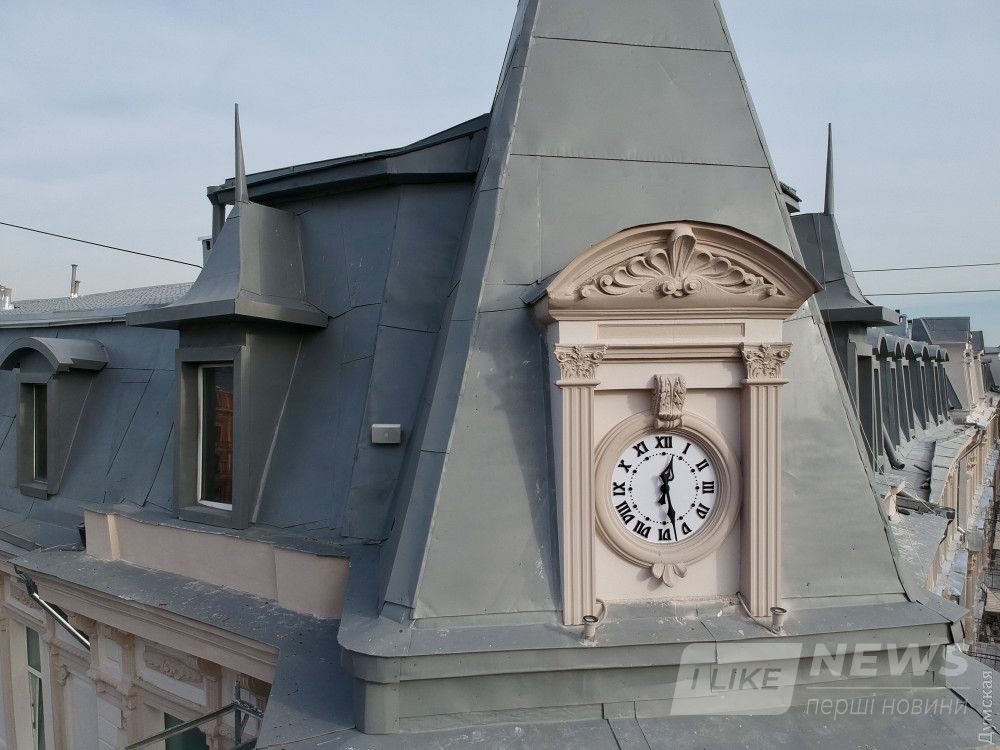 Дерибасовская, 10, доходный дом Стифель. Реставраторы пожадничали, и оставили кровлю из жестяных листов. Зато вернули часы