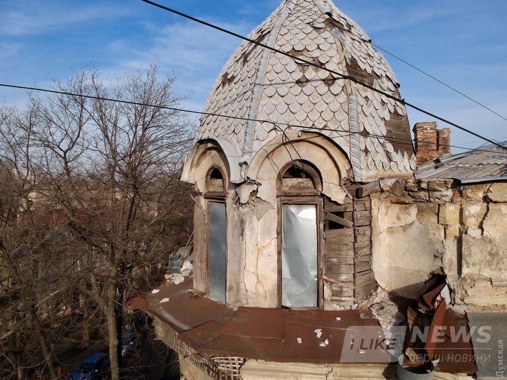 Преображенская, 9 / Софиевская, 34. Жилой дом Толстого. Покрытие башни старое, но слуховое окно закрыли фанерой