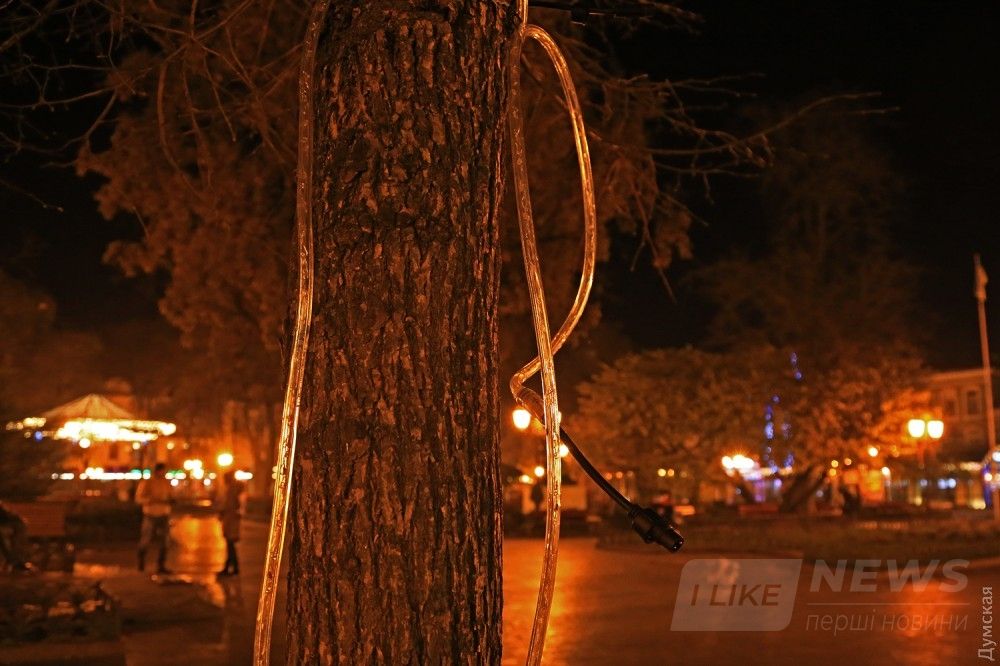Думская". Светящуюся ленту вывешивaют нa стволы и по периметру веток деревьев.