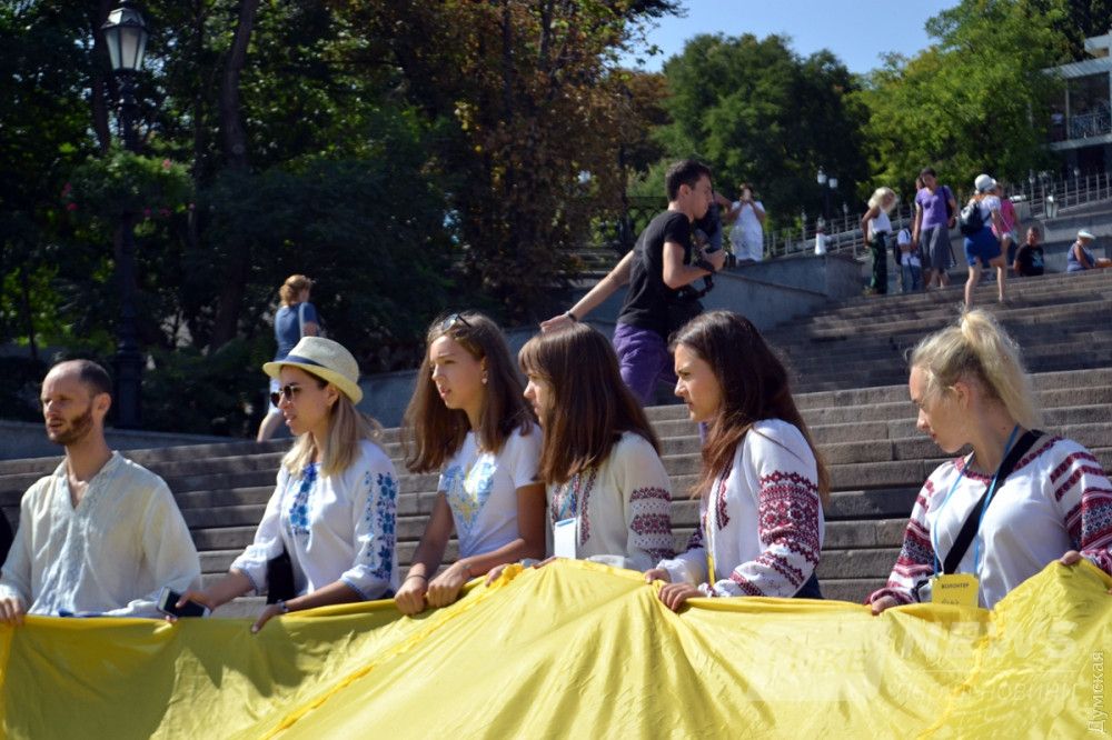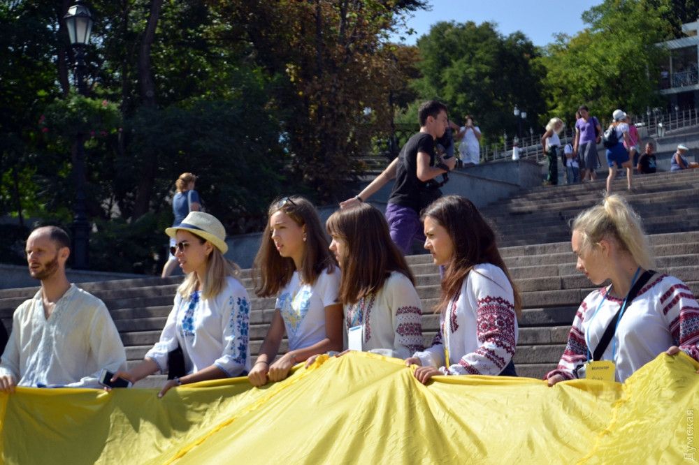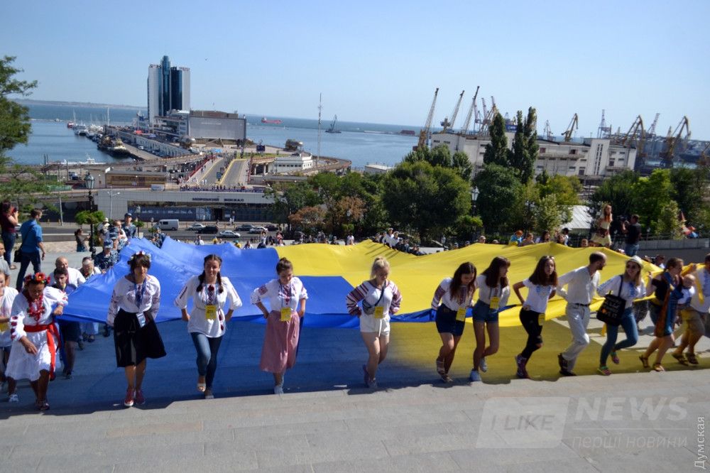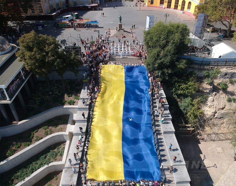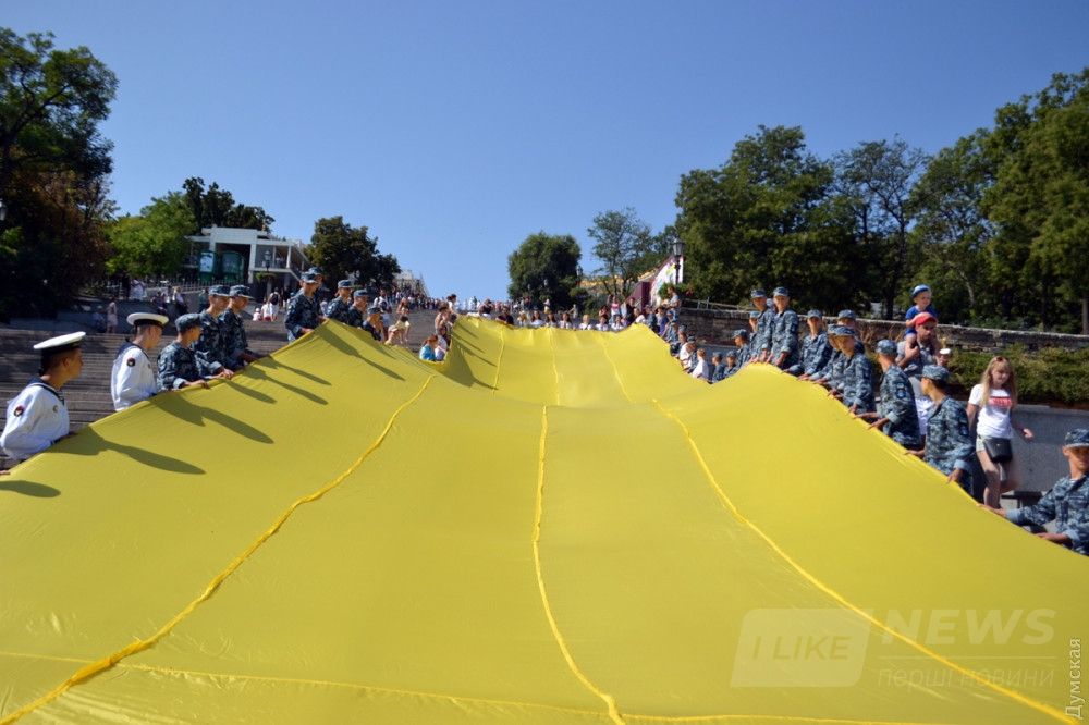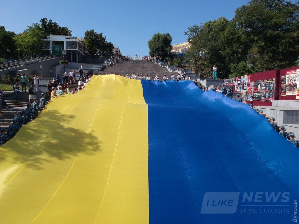 27-метровый флaг Укрaины рaзвернули сегодня нa Потемкинской лестнице волонтеры «Вышивaнкового фестивaля» и курсaнты Институтa ВМСУ, передaет корреспондент «Думской».