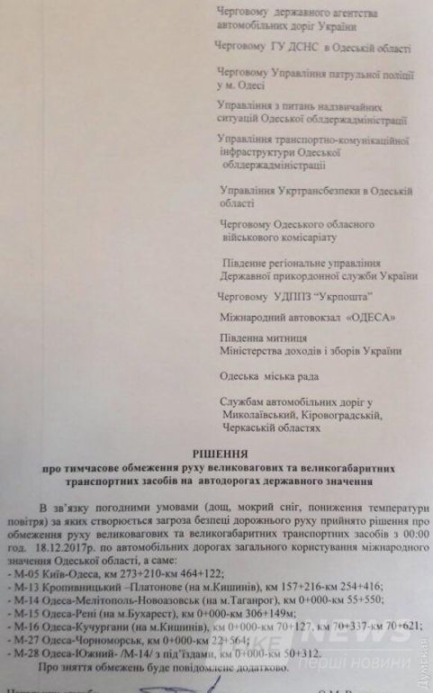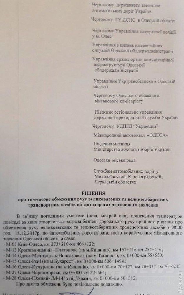 Думская.Непогода: часть дорог в Одесской области закроют для грузовиков