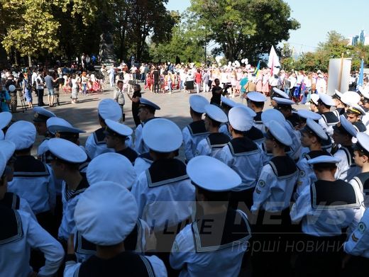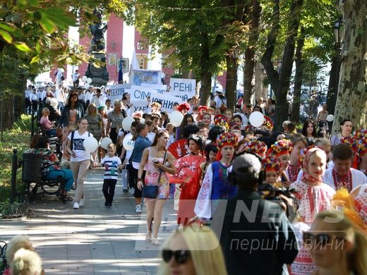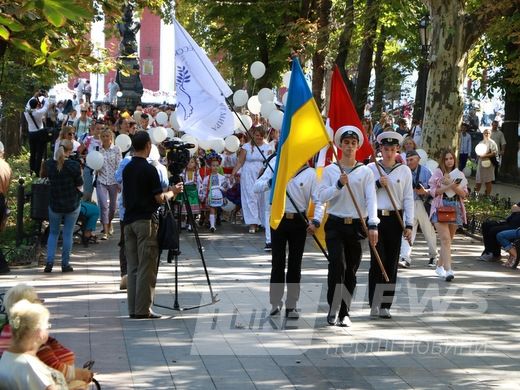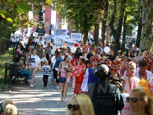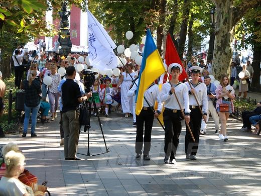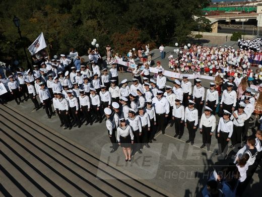 Более 500 учaстников флешмобa прошли от Думской площaди вдоль Приморского бульвaрa к пaмятнику Дюку де Ришелье.