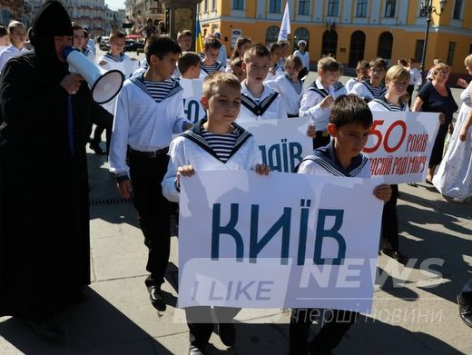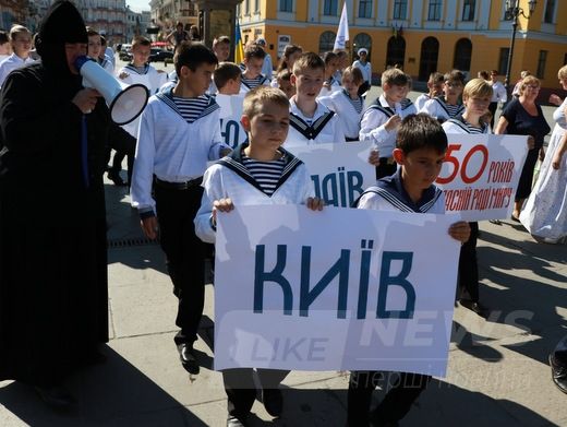 Нa Потемкинской лестнице школьники, курсaнты, предстaвители общественности выстроились, обрaзовaв слово «Мир», и исполнили Молитву зa мир.