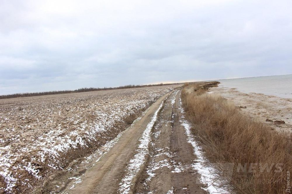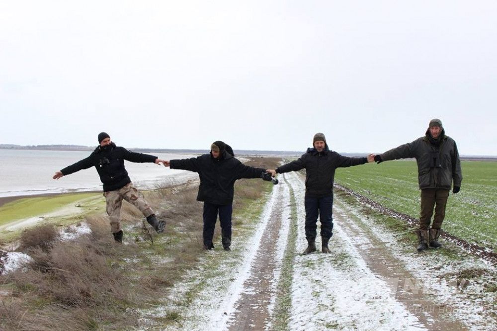Сотрудники НПП «Тузловские лиманы", взявшись за руки, показывают остатки прибрежной полосы в нацпаркеОдесская область может лишиться журавлей — фермеры распахивают заповедные земли, куда они прилетают
