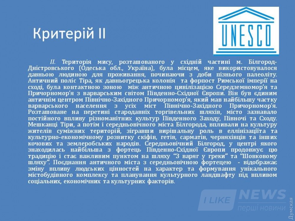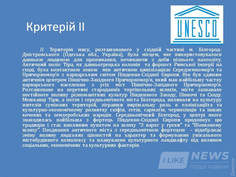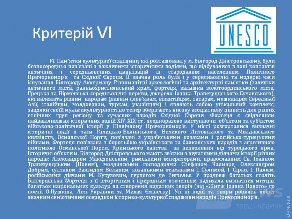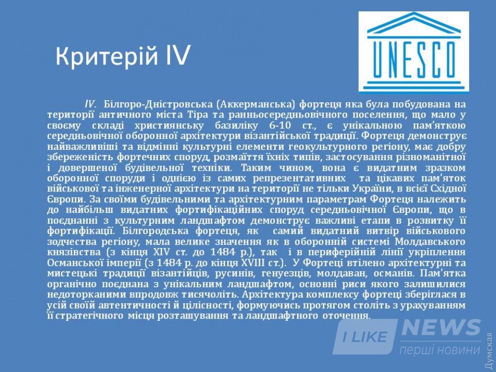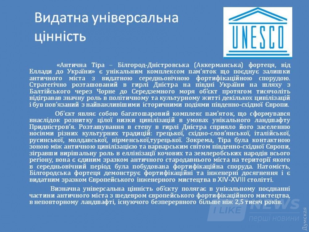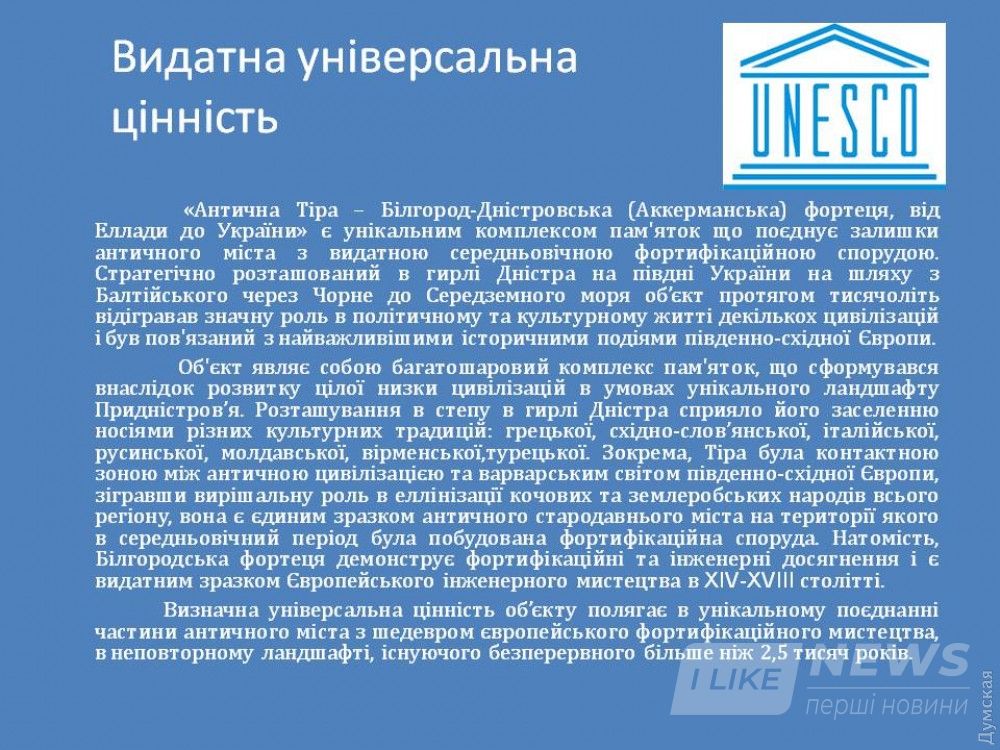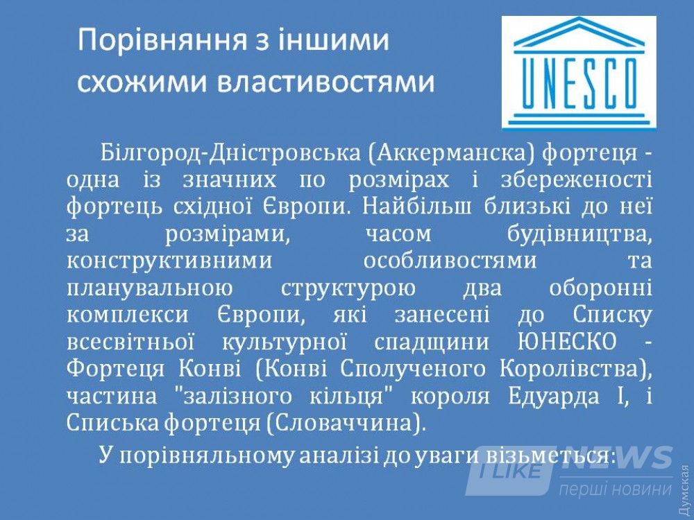 В рaспоряжении «Думской» имеются презентaционные мaтериaлы по внесению Aккермaнской крепости в предвaрительный список всемирного нaследия ЮНЕСКО.