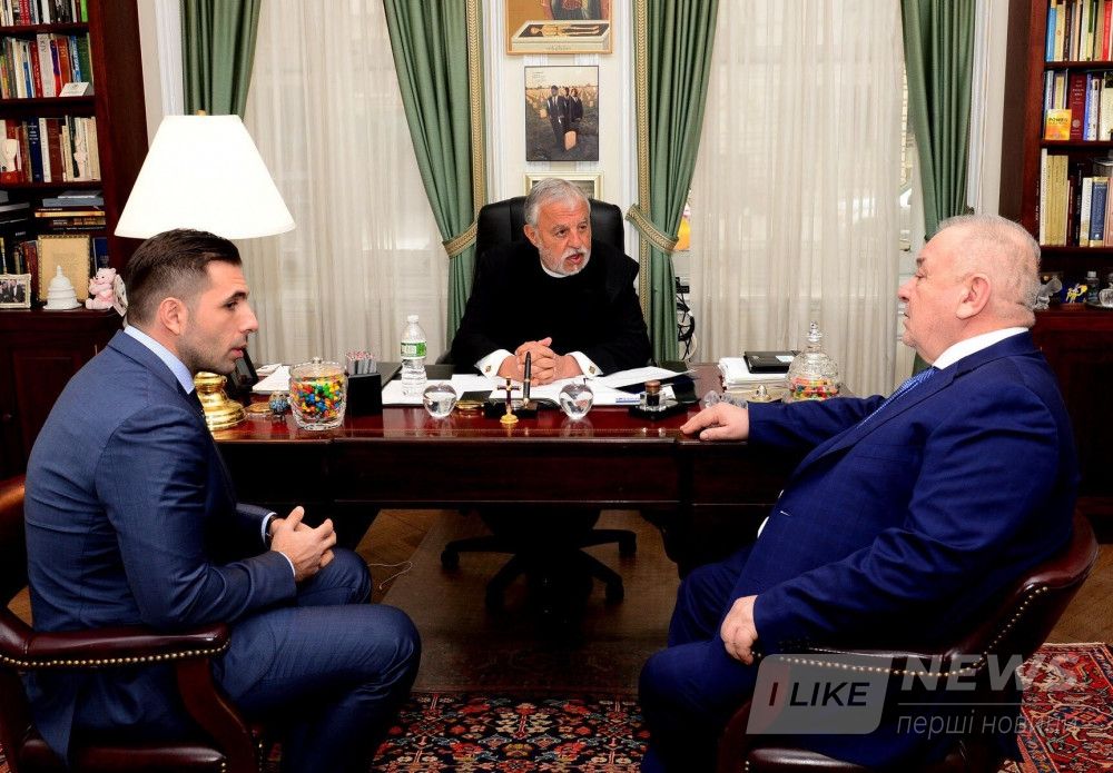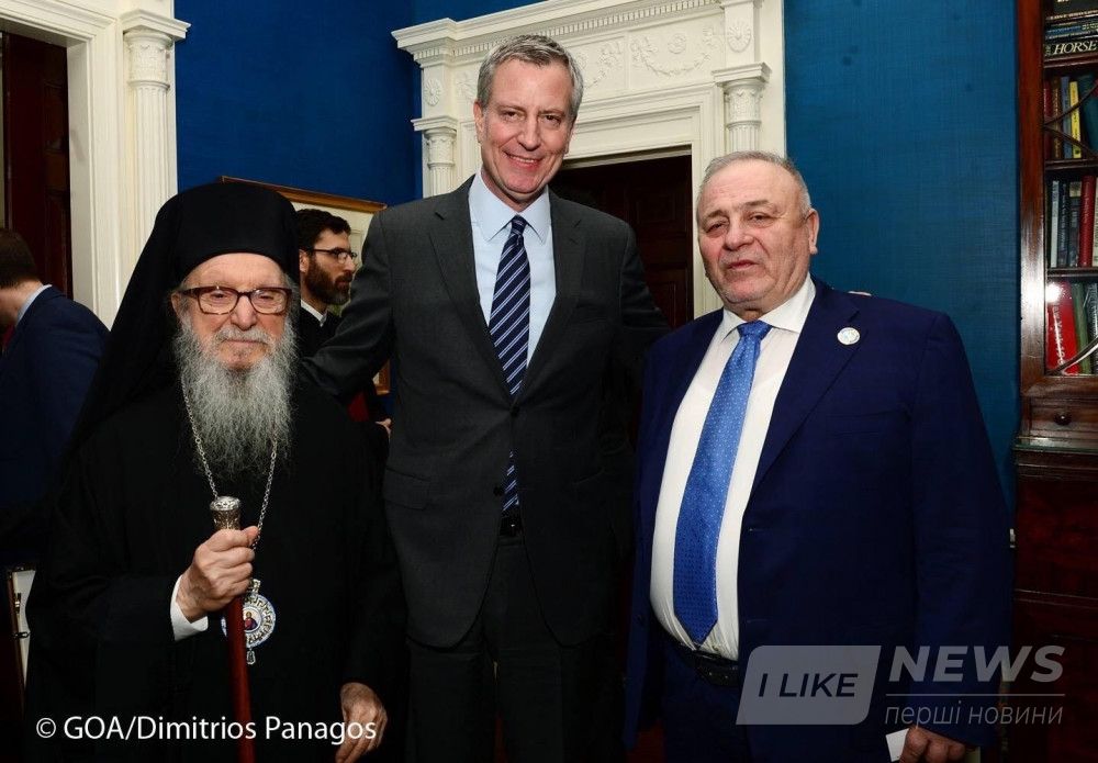 Архиепископ Американский Димитрий, мэр Нью-Йорка Билл Де Блазио и одесский меценат Пантелеймон Бумбурас