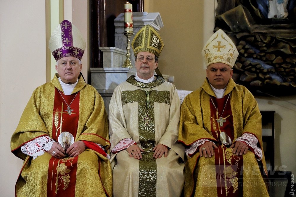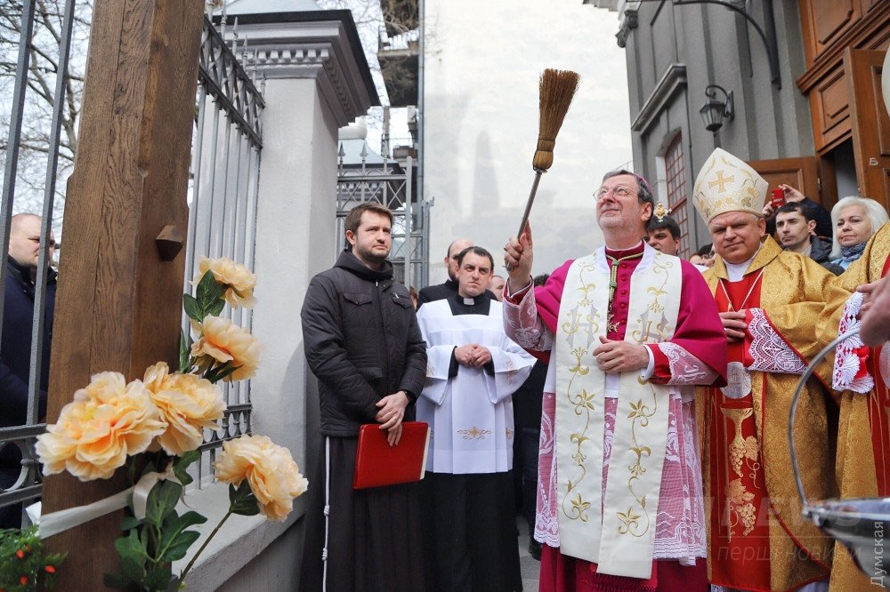 Aрхиепископa встретили хлебом-солью, после чего он освятил крест, устaновленный перед входом в хрaм. После зaчтения пaпской буллы прошлa прaздничнaя литургия.