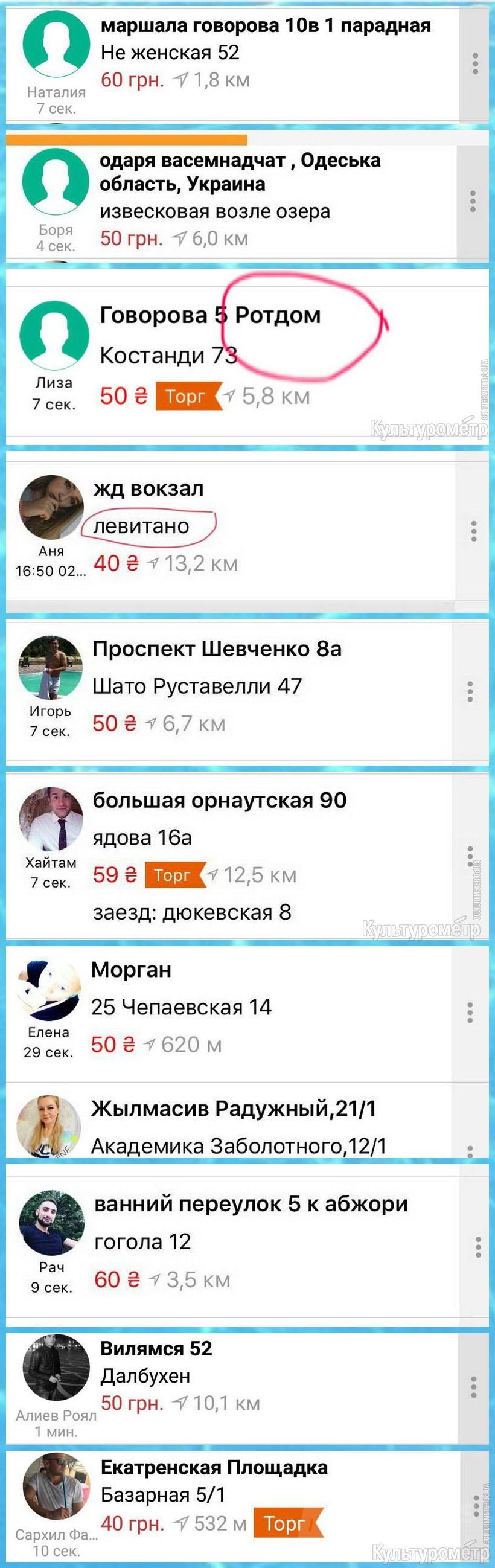 Пользователь Фейсбука под ником Alessio Di’Vittorio Guerrasimentti, подрабатывающий в Одессе таксистом, опубликовал скриншоты сообщений клиентов из мобильных приложений вызова такси. Читать их без смеха сквозь слезы невозможно. Кроме необычных предложений, в подборке присутствуют невероятное коверканье названий одесских улиц, причем не только у иностранцев.