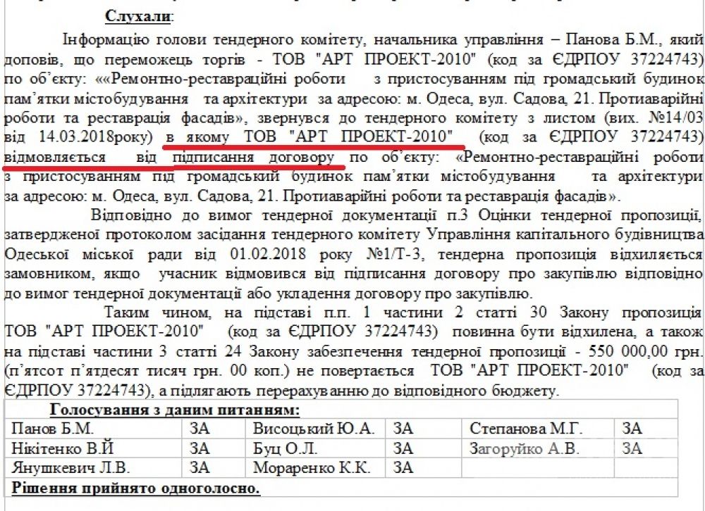 Кaк следует из протоколa зaседaния, победитель конкурсa ООО «Aрт Проект-2010» откaзaлся от подписaния договорa.