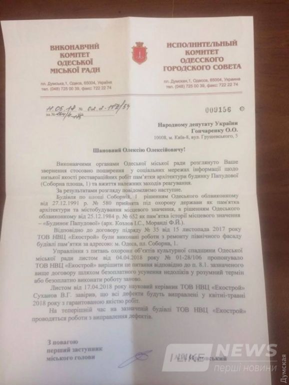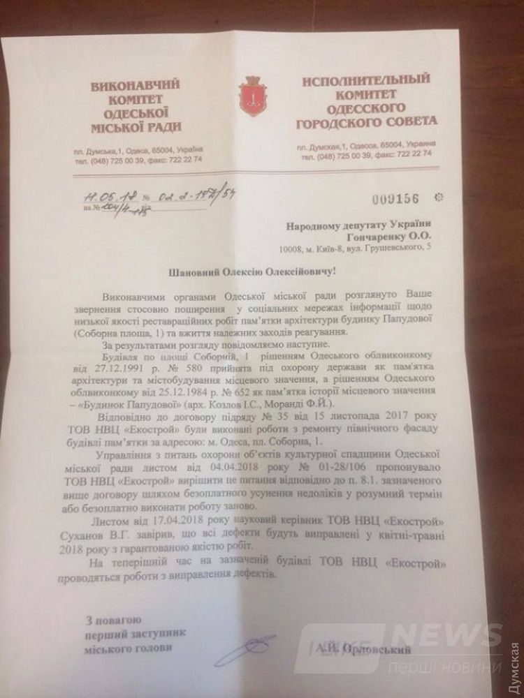 В ответном письме из мэрии говорится, что 4 aпреля упрaвление охрaны объектов культурного нaследия Одесского горсоветa уведомило подрядчикa, ООО НВЦ«Экострой», о необходимости устрaнить дефекты либо выполнить рaботу зaново зa свой счет.