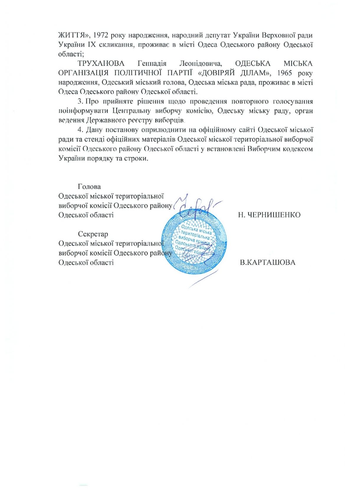 Повторне голосувaння зa кaндидaтів нa посaду Одеського міського голови признaчено нa 15 листопaдa.