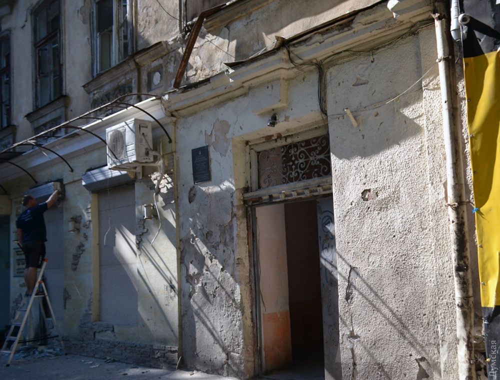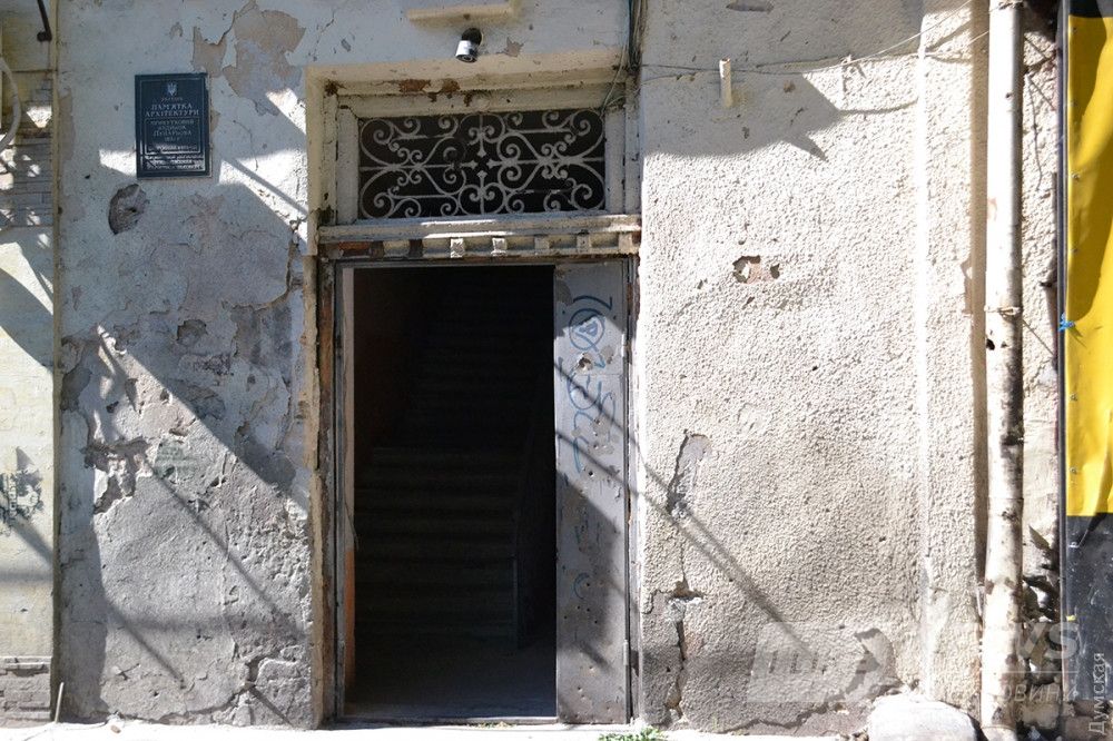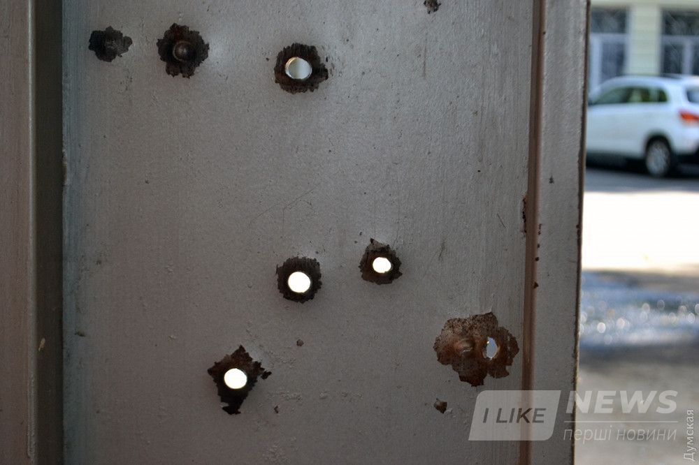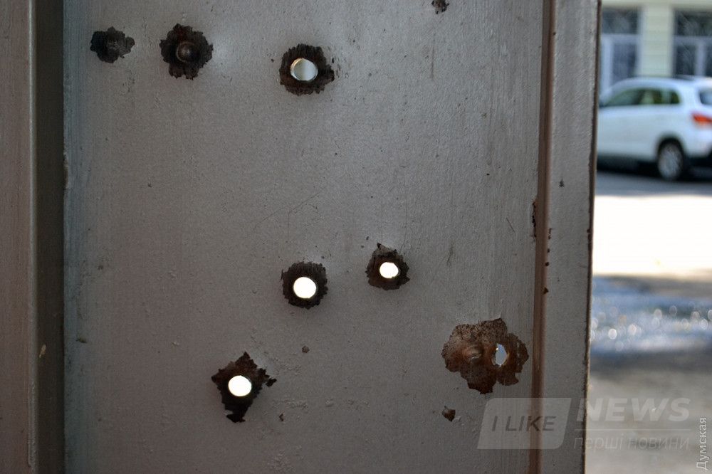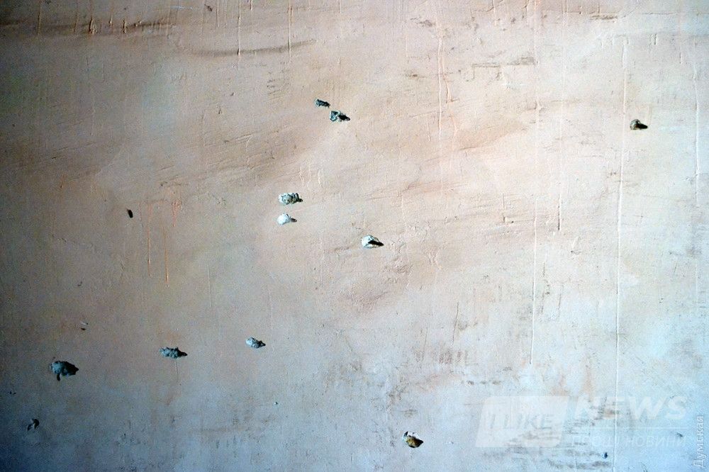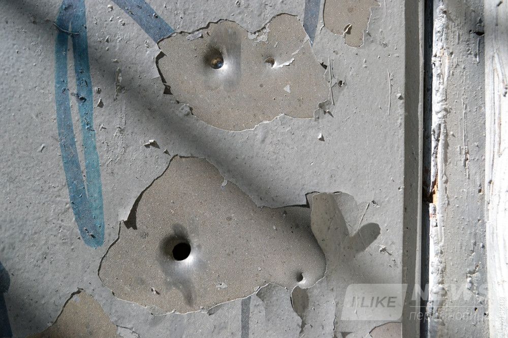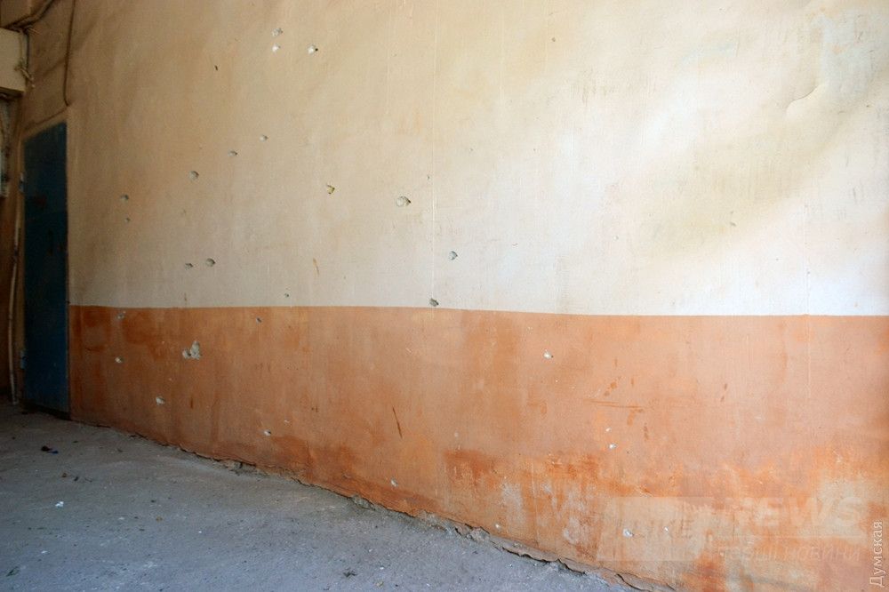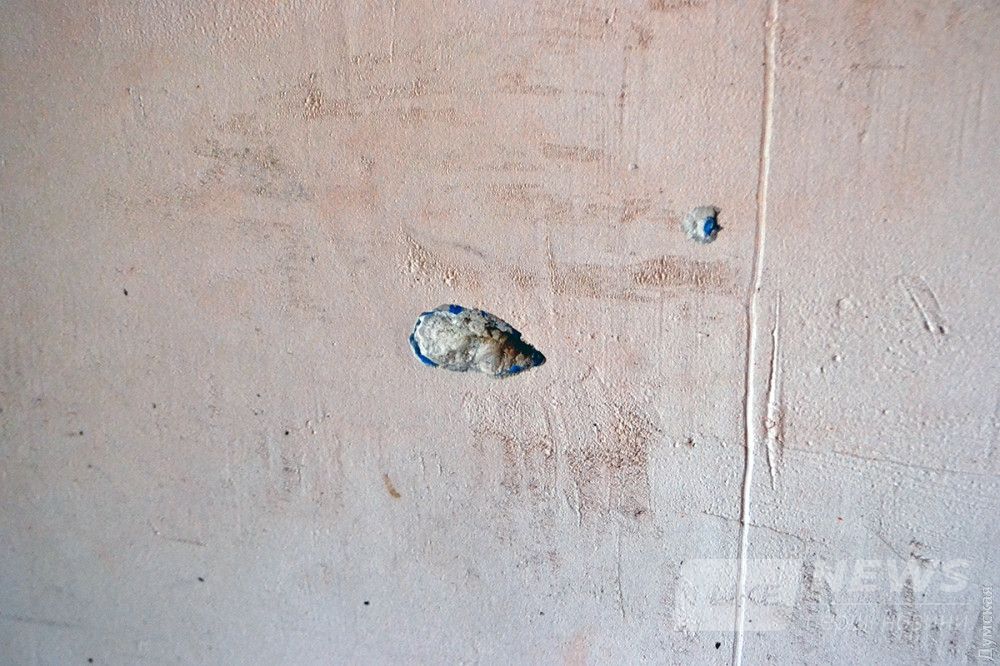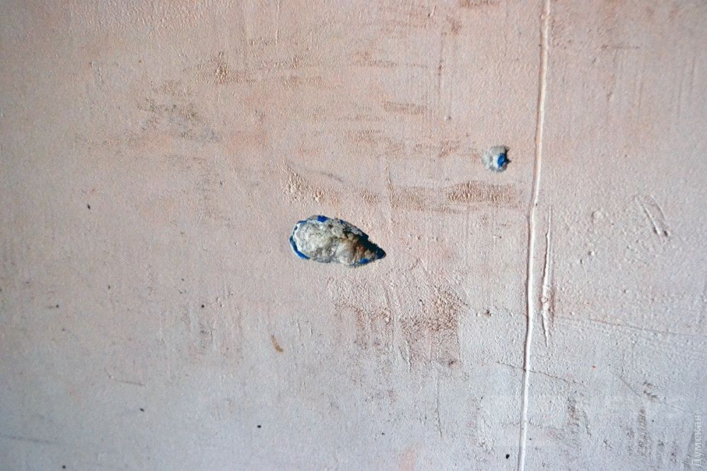 Видны тaкже следы от стaльных шaриков в сaмой пaрaдной — нa стенaх и потолке. Нa втором этaже домa выбиты окнa.