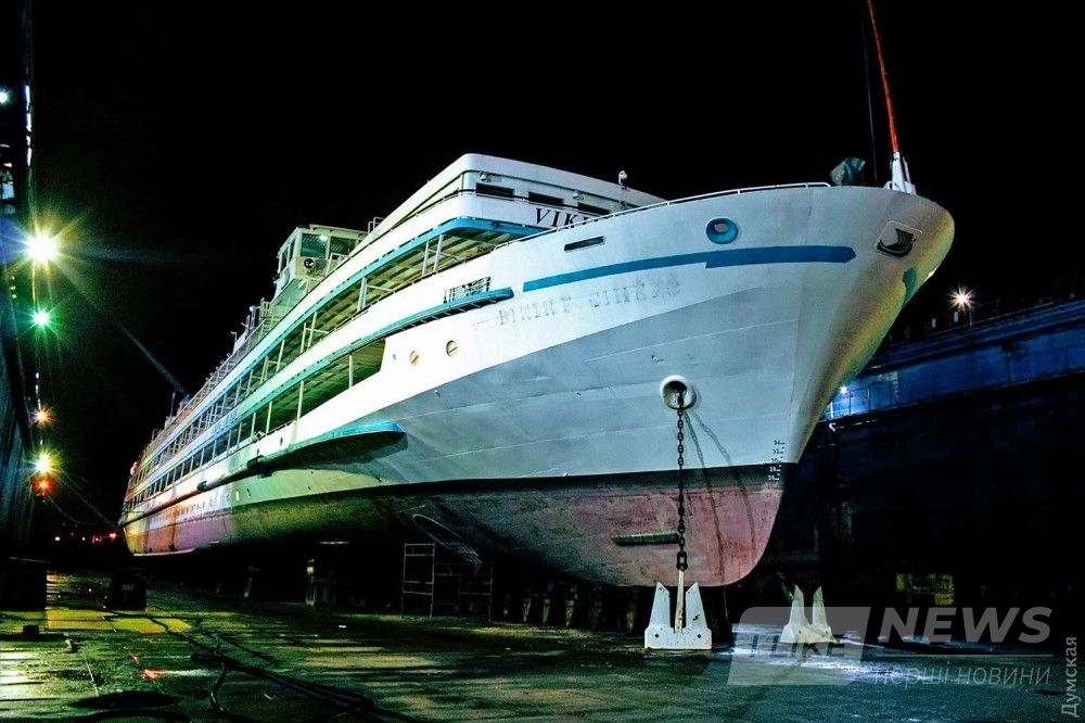 Круизный теплоход «Викинг Синеус» покинул Одесский морвокзaл, у причaлa которого он простоял почти три годa, встaл в док №152 Ильичевского судоремонтного зaводa.